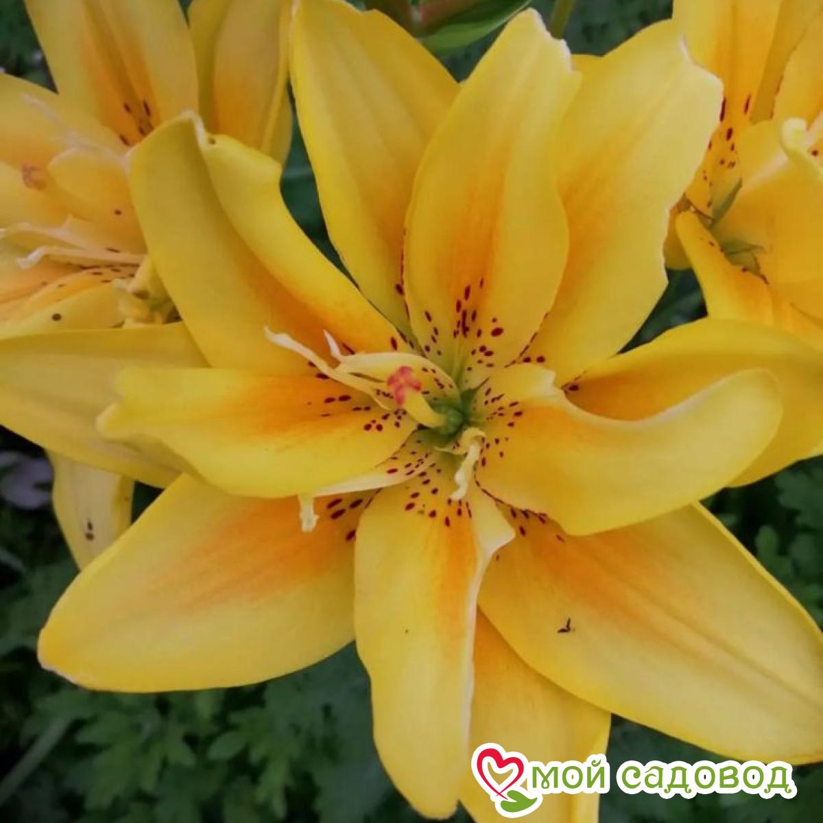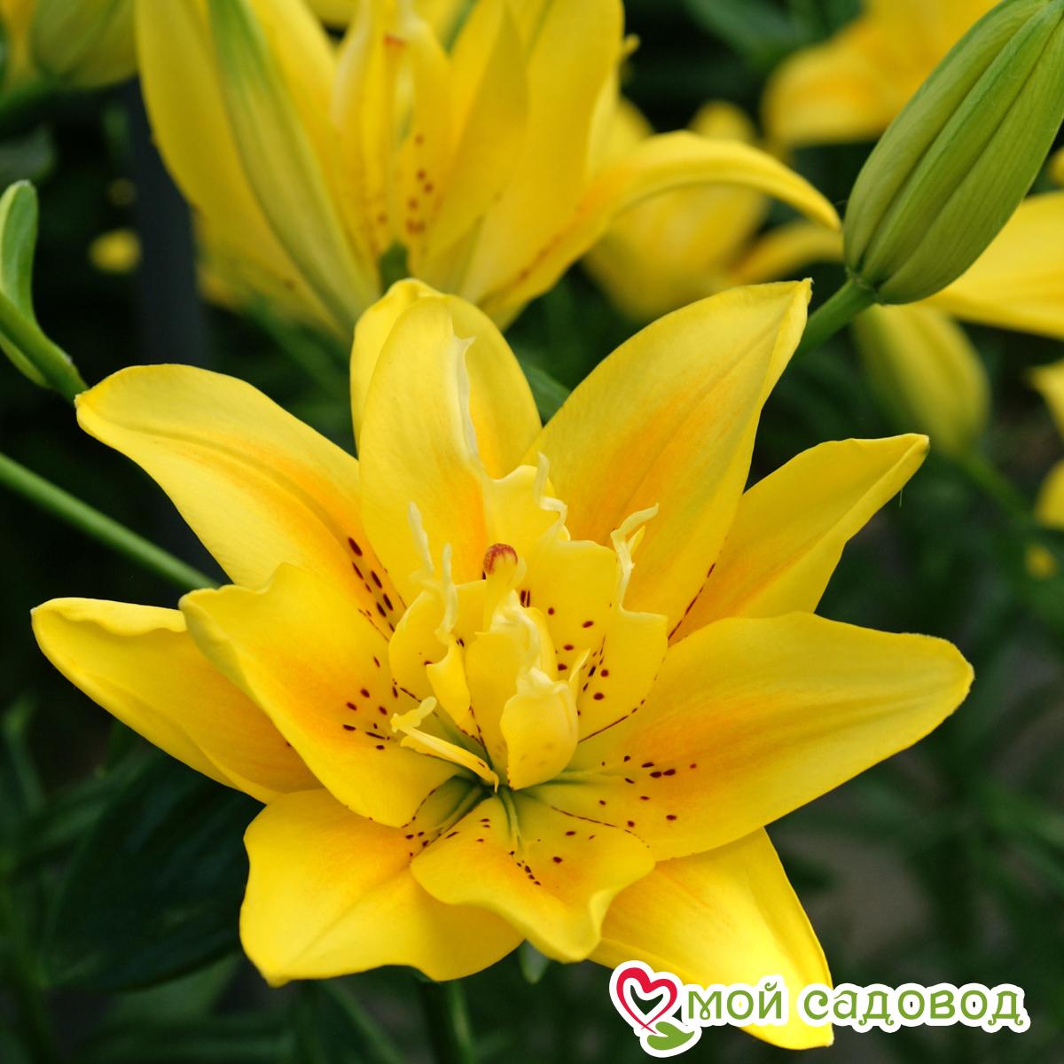 Многолетнее луковичное растение. Куст плотный, лист узкий, зеленый. Цветки махровые, лилиецветные, 17 см, воронковидные, одиночные, или собраны в пирамидальные соцветия, расположены на конце цветоноса, лепестки цветка восковидной фактуры. Цветение обильное и продолжительное, декоративность сохраняется до конца осени. Высота растений 1,20 м, окраска цветка ярко-желтая, пыльники светлые, бордовый крап. Уход за лилиями включает в себя прополки, поливы, рыхления, подкормки, борьбу с болезнями и вредителями. Поливают лилии в период цветения, поддерживая почву в увлажненном состоянии. Чтобы избежать пересыхания и перегрева почву мульчируют перегноем или торфом слоем в 5-6 см. Лилии хорошо отзываются на подкормки. Первую подкормку проводят весной после схода снега, разбрасывая по поверхности почвы азотные удобрения. Во время бутонизации растения поливают растворенной в воде аммиачной селитрой, непосредственно перед цветением использую фосфорно-калийные удобрения в жидком виде, в конце лета, но не позднее середины августа, лилии подкармливают фосфором и калием. Выращивать лилии на одном месте дольше 3-4 лет крайне нежелательно: луковица нарастает, становится рыхлой, растениям становится тесно по соседству. На 5 -6 год заметно снижается высота цветоноса, количество бутонов и значит, луковица истощена, а это может привести к заболеваниям и гибели растения. Осенью, когда надземная часть растения отмерла, стебель обрезают на высоте 15 см от поверхности почвы, гнездо выкапывают целиком, отделяют от материнской луковицы детки и высаживают их на доращивание. Саму материнскую луковицу пересаживают на новое место. В нашем интернет-магазине вы сможете купить Лилии Так же возможно вас заинтересуют Лилия-дерево Пурпл Принц и Лилия (ЛО-гибрид) Пинк Хевен
